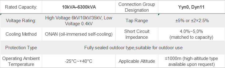 Key parameters: Capacity 10kVA–6300kVA, high voltage 6/10/35kV, low voltage 0.4kV, oil-immersed self-cooling, fully sealed protection, suitable for environments from -25℃ to +40℃, and has passed all factory testing, ensuring quality.